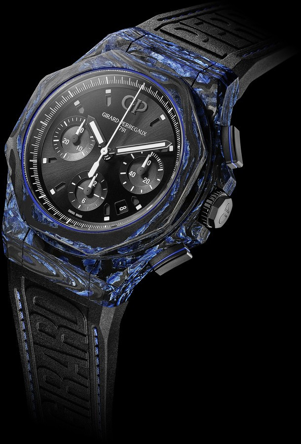 Часы Girard-Perregaux Laureato Absolute Chronograph Carbon Glass представлены в корпусе из углеродного стекла размером 44 мм и водонепроницаемостью 300 м. Внутри корпуса установлен автоматический механизм, Калибр GP03300-1058, обладающий запасом хода 46 часов. На черном циферблате отображаются часы, минуты, секунды и дата, накопители хронографа. Часы комплектуются каучуковым ремешком с титановой вставкой.