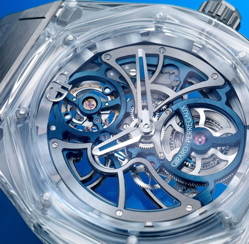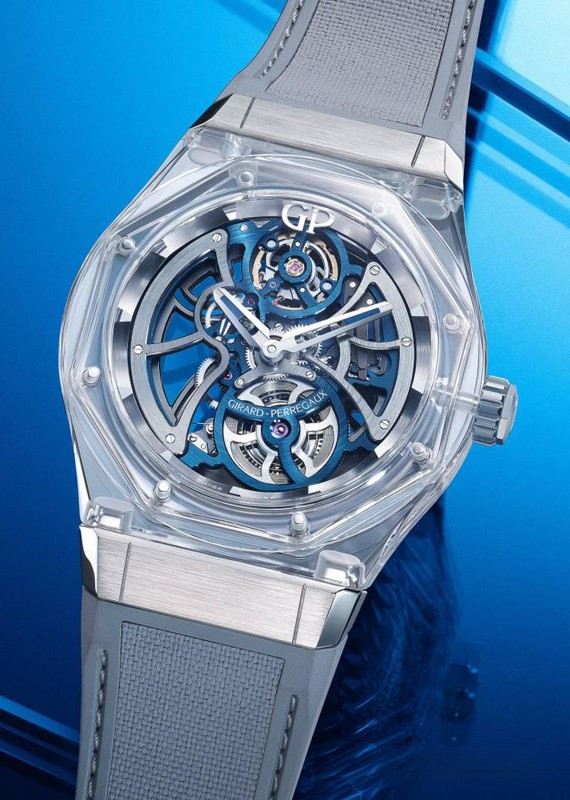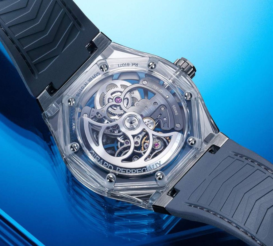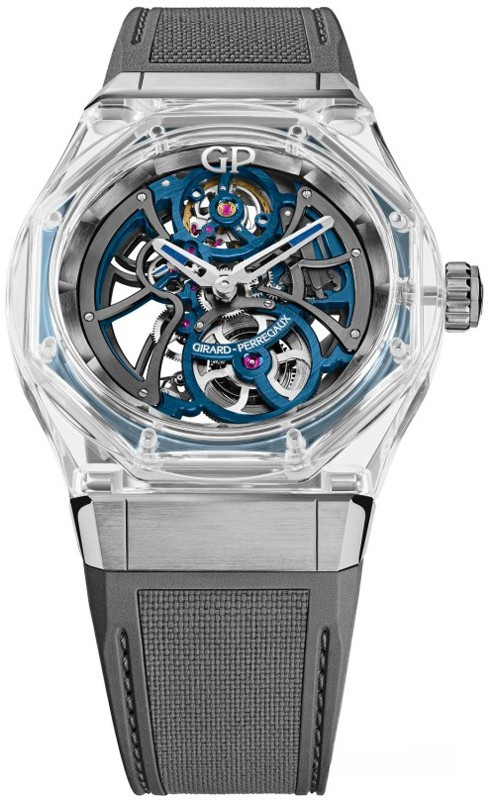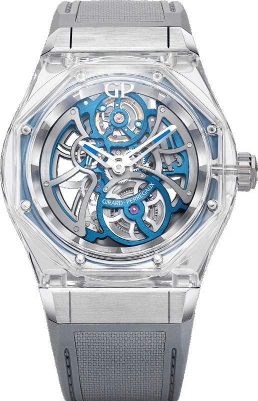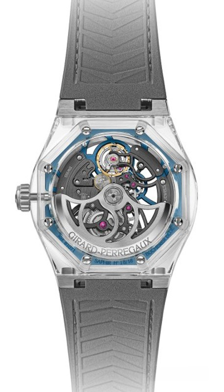 Новинка от Girard-Perregaux – Laureato Absolute Light – выпущена ограниченной серией 18 экземпляров. Конструкция часов позволяет наблюдать за механизмом со всех сторон благодаря прозрачному корпусу 44 x 11.56 мм из сапфира и титана. Базовая пластина механизма имеет восьмиугольную форму и соединена с безелем, корпусом и задней крышкой. Восьмиугольный безель подчеркивает типичную форму модели. Обработанные люминесцентным материалом, скелетированные стрелки вращаются на фоне циферблата. Механизм GP01800 обладает балансовой частотой 28 800 пк/ч и запасом хода 54 часа. Калибр оснащен скелетированнм ротором, который не препятствует обзору механизма. Каучуковый ремешок легко интегрируется в часы. Он оснащен системой микрорегулировки на титановой складной пряжке. Girard-Perregaux Laureato Absolute Light обладает водонепроницаемостью до 30 метров.