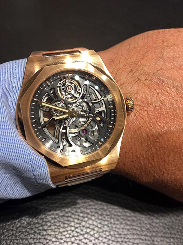 Girard-Perregaux представили часы Laureato Skeleton – скелетон с металлическим браслетом. Модель Laureato была создана в 1970 году и вобрала в себя богатство итальянского искусства, истории и форм. Одной из главных изюминок новых часов является металлический браслет, состоящий из звеньев с чередованием матовых и сатинированных поверхностей. Ушки часов интегрированы в корпус и являются неотъемлемой частью его конструкции. Полированный восьмигранный безель, обрамленный кругом, показывает стремление к сбалансированным пропорциям и эргономике. Корпус Laureato Skeleton обладает размерами 42 х 10.88 мм и изготовлен из розового золота 18к. Браслет изготовлен из того же металла, что и корпус часов. Внутри корпуса находится мануфактурный механизм GP01800-0006, искусно скелетированный мастерами мануфактуры. Колесо баланса расположено на отметке 12 часов на фоне филигранно обработанной металлической структуры. Превосходная точность этой модели еще больше усиливается за счет использования баланса с переменной инерцией. Калибр GP01800-0006 полностью разработан, изготовлен, финиширован и собран в стенах мануфактуры Girard-Perregaux. Он регулирует функции часов, минут и маленькой секундной стрелки. Мосты и колонны представляют собой металлические кривые. Калибр отличается воздушностью и одновременно прочностью. Прозрачная конструкция позволяет разглядеть ротор, вырезанный из блока розового золота 18к и скелетированный, как и остальная часть механизма. Ротор, который обычно закрывает и скрывает другие элементы, в новинке позволяет свету проходить сквозь Laureato Skeleton подобно витражному стеклу.