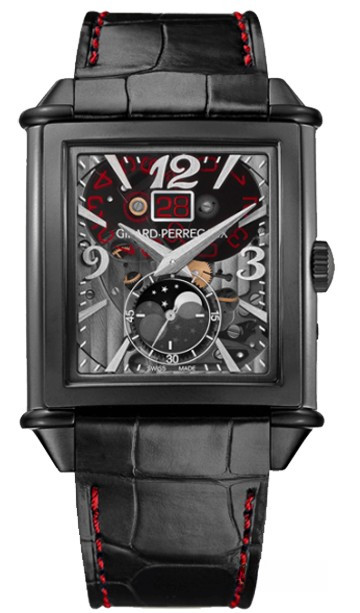 Часы выпущены в корпусе из титана. Серебристый циферблат включает крупный индикатор даты в позиции 12 часов и субциферблат для индикатора фазы луны в районе 6 часов. Тщательно отполированный механизм GP03300-0124 с автоматическим заводом имеет модуль для усложнений. Он работает с частотой 4 Гц (28 800 пк/час) и гарантирует около 46 часов запаса хода. Разумеется, этот автоматический механизм виден сквозь сапфировое стекло задней части корпуса. Часы Girard-Perregaux Vintage 1945 XXL Large Date And Moon Phases оснащены ремешком из кожи аллигатора с вставкой из нержавеющей стали.