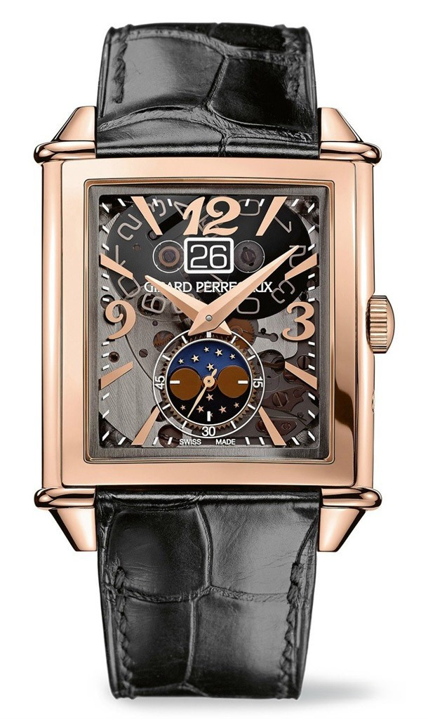 Часы выпущены в корпусе из розового золота 18к. Прозрачный циферблат включает крупный индикатор даты в позиции 12 часов и субциферблат для индикатора фазы луны в районе 6 часов. Часовой механизм установлен за серым тонированным сапфировым стеклом. Тщательно отполированный механизм Girard-Perregaux Калибр GP03300-0105 с автоматическим заводом имеет модуль для усложнений. Он работает с частотой 4 Гц (28 800 пк/час) и гарантирует около 46 часов запаса хода. Разумеется, этот автоматический механизм виден сквозь сапфировое стекло задней части корпуса. Часы Girard-Perregaux Vintage 1945 XXL Large Date And Moon Phases оснащены привлекательным черным ремешком из кожи аллигатора. Такие ремешки придают свежесть оригинальным и более сдержанным часам коллекции в ретро-стиле.