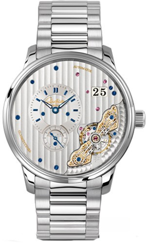 Часы PanoMaticInverse Automatic от Glashutte Original выпущены в корпусе из нержавеющей стали диаметром 42 мм. Водонепроницаемый до 50 метров, корпус с обеих сторон защищен антибликовым сапфировым стеклом. На 3-х часах размещена рифленая заводная коронка с выгравированным логотипом бренда Glashutte Original на торце. Великолепно отделанная лицевая сторона калибра выступает в роли циферблата, оснащенного воронеными стрелками с белым люминесцентным покрытием и накладными часовыми метками. Индикация времени осуществляется на децентрализованном циферблате в районе 10-ти часов. Маленькая секундная стрелка вынесена на боковой циферблат на 7-ми часах. Цифровая негабаритная апертура даты расположена на 2-х часах. Часы базируются на мануфактурном немецком автоматическом Калибре Glashutte Original 91-02. Комплектуются стальным браслетом.