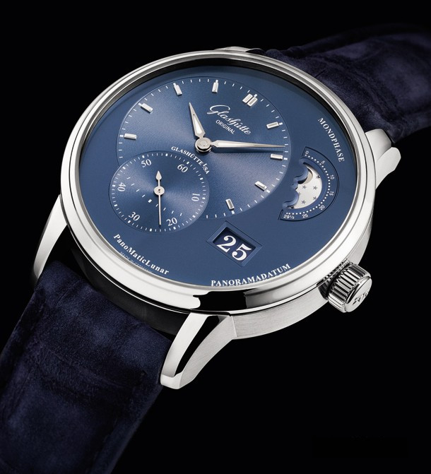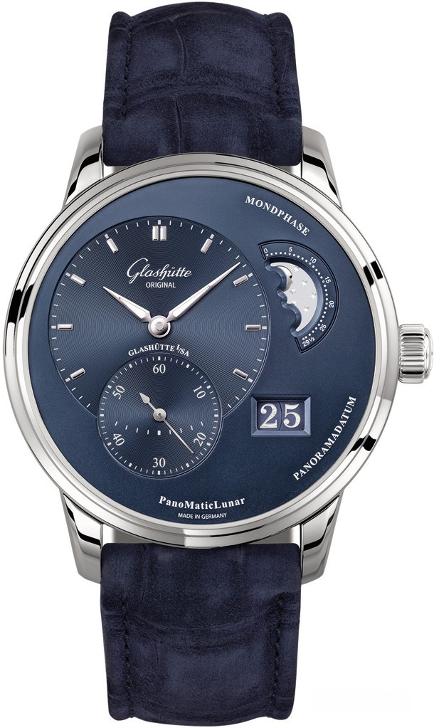 В часах PanoMaticLunar от Glashutte Original особое внимание уделено яркому, чистому дизайну с его смещенными от центра часовой и минутной стрелками и секундным дисплеем. Часовая/минутная и секундная стрелки лежат на вертикальной оси в пределах левой половины циферблата, в то время как апертура панорамной даты и индикатор фазы Луны расположены, соответственно, на нижнем и левом верхнем участках. Размещение отдельных индикаторов выполнено по принципу "Золотого сечения" – легендарного закона эстетической гармонии. Модель представлена корпусом из нержавеющей стали с синим циферблатом, часовой, минутной и секундной стрелками, а также 9 часовыми индексами. Эксклюзивный дисплей индикатора фаз Луны демонстрирует звезды и луну на серебряном небе. Часы PanoMaticLunar укомплектованы механическим Калибром 90-02 – автоматическим часовым механизмом с 47 камнями и 42 часами запаса хода. Задняя сапфировая часть корпуса открывает широкий вид на изысканный часовой механизм и его характерные для Glashutte элементы: трех четвертная палета с линейными узорами Glashutte, смещенный от центра ротор из золота 21к, вороненые винты и вручную гравированный балансовый мост с регулятором «лебединая шея».