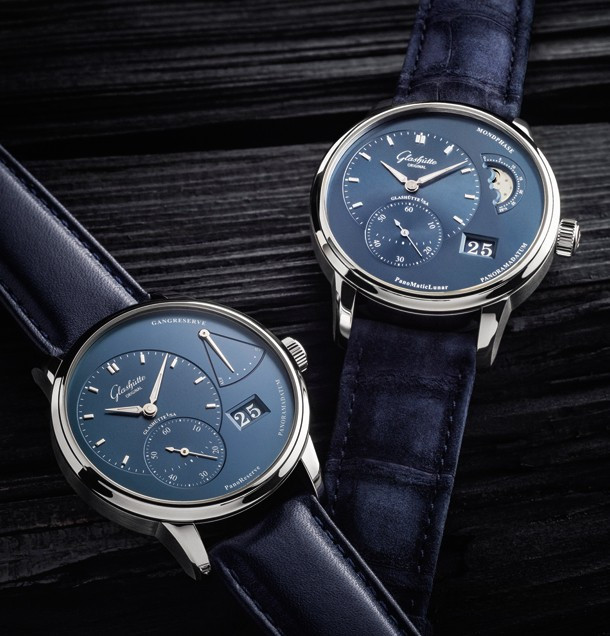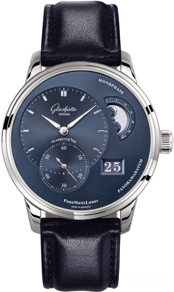 В часах PanoMaticLunar от Glashutte Original особое внимание уделено яркому, чистому дизайну с его смещенными от центра часовой и минутной стрелками и секундным дисплеем. Часовая/минутная и секундная стрелки лежат на вертикальной оси в пределах левой половины циферблата, в то время как апертура панорамной даты и индикатор фазы Луны расположены, соответственно, на нижнем и левом верхнем участках. Размещение отдельных индикаторов выполнено по принципу "Золотого сечения" – легендарного закона эстетической гармонии. Модель представлена корпусом из нержавеющей стали с синим циферблатом, часовой, минутной и секундной стрелками, а также 9 часовыми индексами. Эксклюзивный дисплей индикатора фаз Луны демонстрирует звезды и луну на серебряном небе. Часы PanoMaticLunar укомплектованы механическим Калибром 90-02 – автоматическим часовым механизмом с 47 камнями и 42 часами запаса хода. Задняя сапфировая часть корпуса открывает широкий вид на изысканный часовой механизм и его характерные для Glashutte элементы: трех четвертная палета с линейными узорами Glashutte, смещенный от центра ротор из золота 21к, вороненые винты и вручную гравированный балансовый мост с регулятором «лебединая шея».