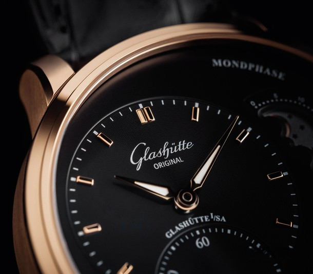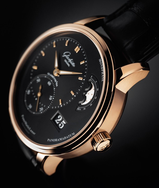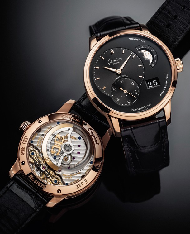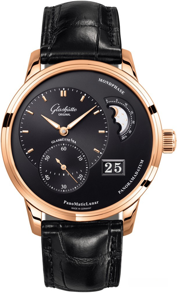 В часах PanoMaticLunar от Glashutte Original особое внимание уделено яркому, чистому дизайну с его смещенными от центра часовой и минутной стрелками и секундным дисплеем. Часовая/минутная и секундная стрелки лежат на вертикальной оси в пределах левой половины циферблата, в то время как апертура панорамной даты и индикатор фазы Луны расположены, соответственно, на нижнем и левом верхнем участках. Размещение отдельных индикаторов выполнено по принципу "Золотого сечения" – легендарного закона эстетической гармонии. Модель представлена корпусом из розового золота с черным матовым циферблатом, часовой, минутной и секундной золотыми стрелками, а также 9 золотыми часовыми индексами. Эксклюзивный дисплей индикатора фаз Луны демонстрирует звезды и золотую луну на серебряном небе. Часы PanoMaticLunar укомплектованы механическим Калибром 90-02 – автоматическим часовым механизмом с 47 камнями и 42 часами запаса хода. Задняя сапфировая часть корпуса открывает широкий вид на изысканный часовой механизм и его характерные для Glashutte элементы: трех четвертная палета с линейными узорами Glashutte, смещенный от центра ротор из золота 21к, вороненые винты и вручную гравированный балансовый мост с регулятором «лебединая шея».