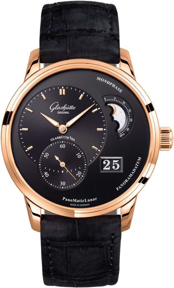 В часах PanoMaticLunar от Glashutte Original особое внимание уделено яркому, чистому дизайну с его смещенными от центра часовой и минутной стрелками и секундным дисплеем. Часовая/минутная и секундная стрелки лежат на вертикальной оси в пределах левой половины циферблата, в то время как апертура панорамной даты и индикатор фазы Луны расположены, соответственно, на нижнем и левом верхнем участках. Размещение отдельных индикаторов выполнено по принципу "Золотого сечения" – легендарного закона эстетической гармонии. Модель представлена корпусом из розового золота с черным матовым циферблатом, часовой, минутной и секундной золотыми стрелками, а также 9 золотыми часовыми индексами. Эксклюзивный дисплей индикатора фаз Луны демонстрирует звезды и золотую луну на серебряном небе. Часы PanoMaticLunar укомплектованы механическим Калибром 90-02 – автоматическим часовым механизмом с 47 камнями и 42 часами запаса хода. Задняя сапфировая часть корпуса открывает широкий вид на изысканный часовой механизм и его характерные для Glashutte элементы: трех четвертная палета с линейными узорами Glashutte, смещенный от центра ротор из золота 21к, вороненые винты и вручную гравированный балансовый мост с регулятором «лебединая шея».