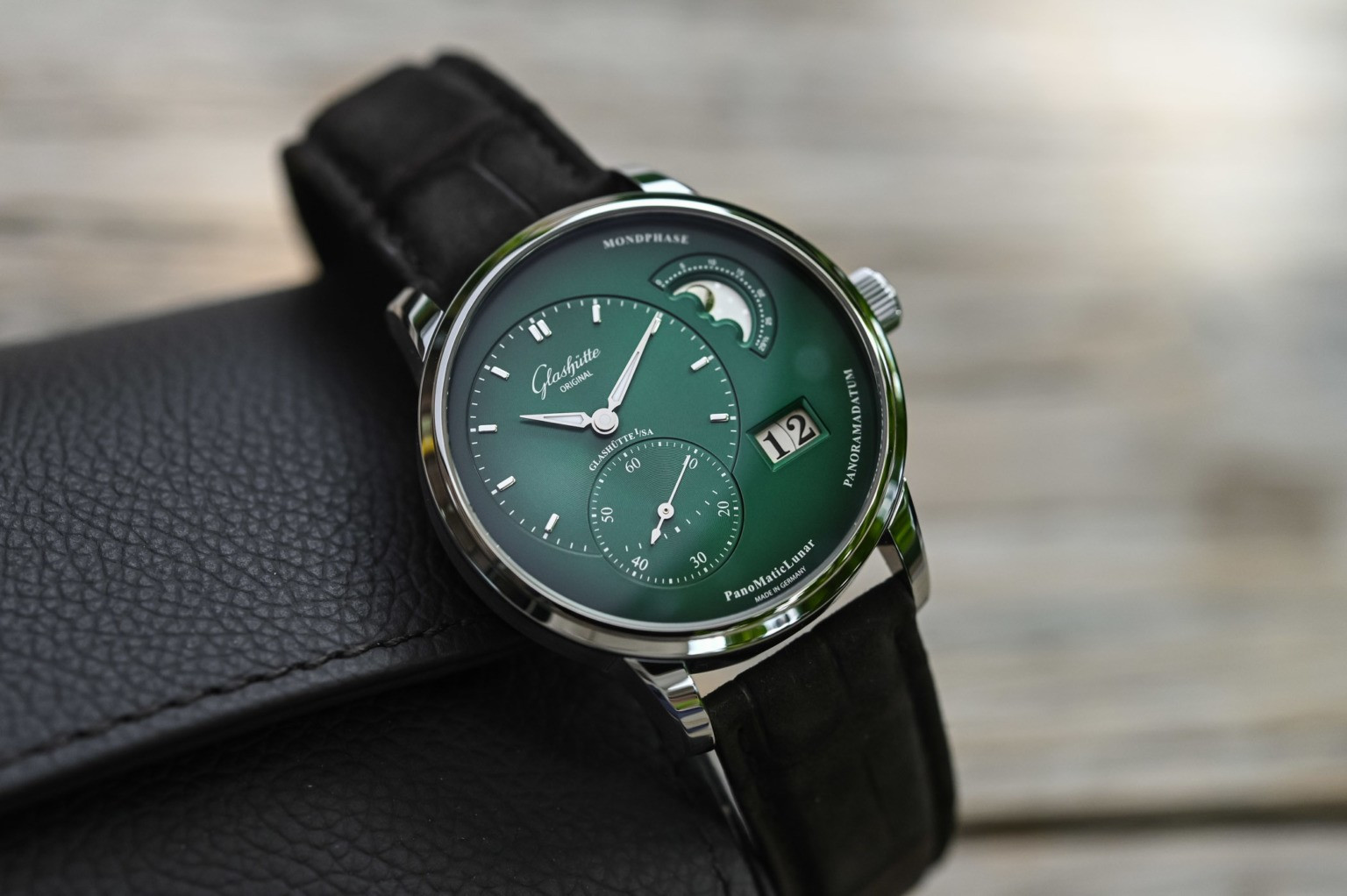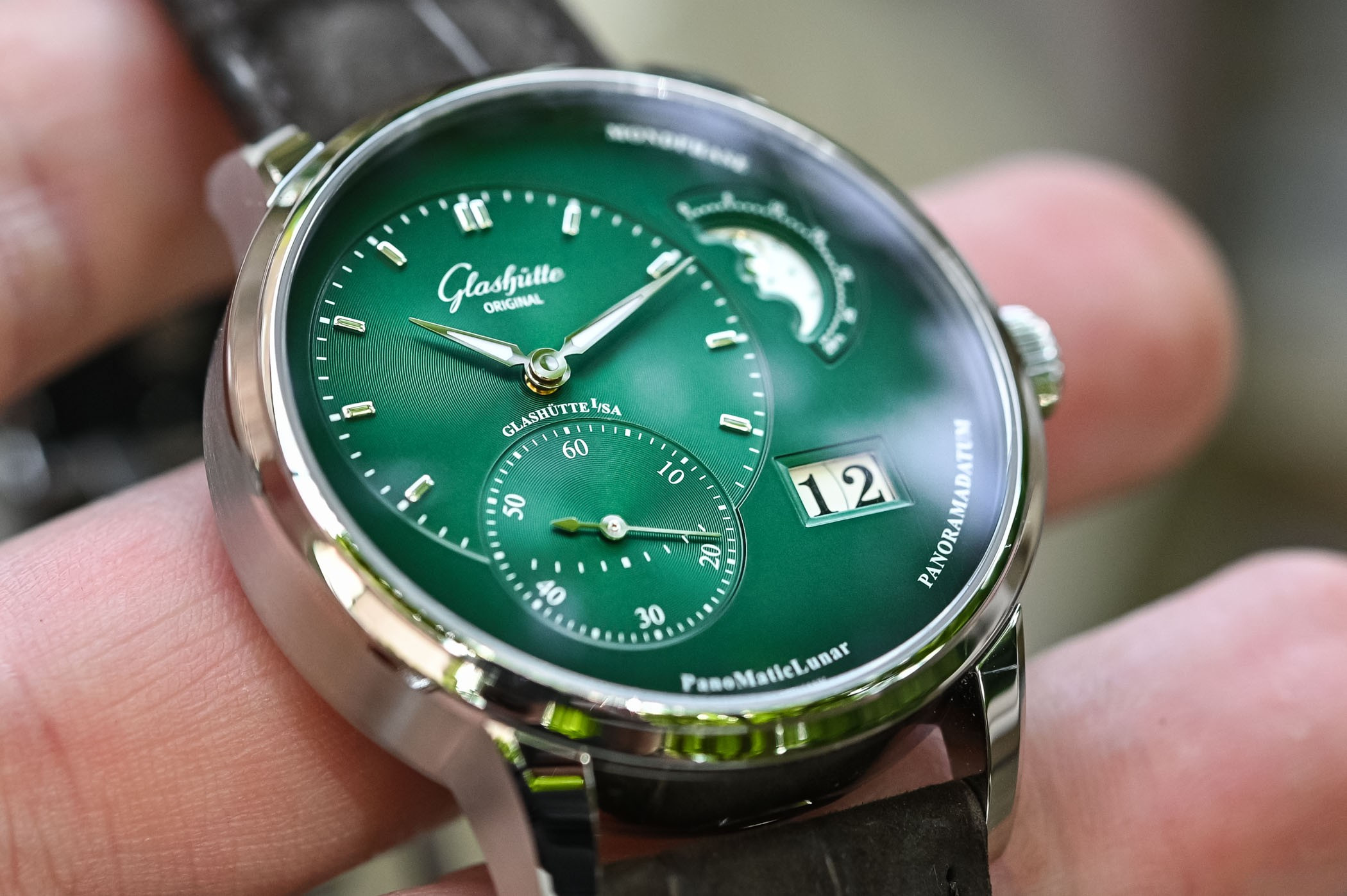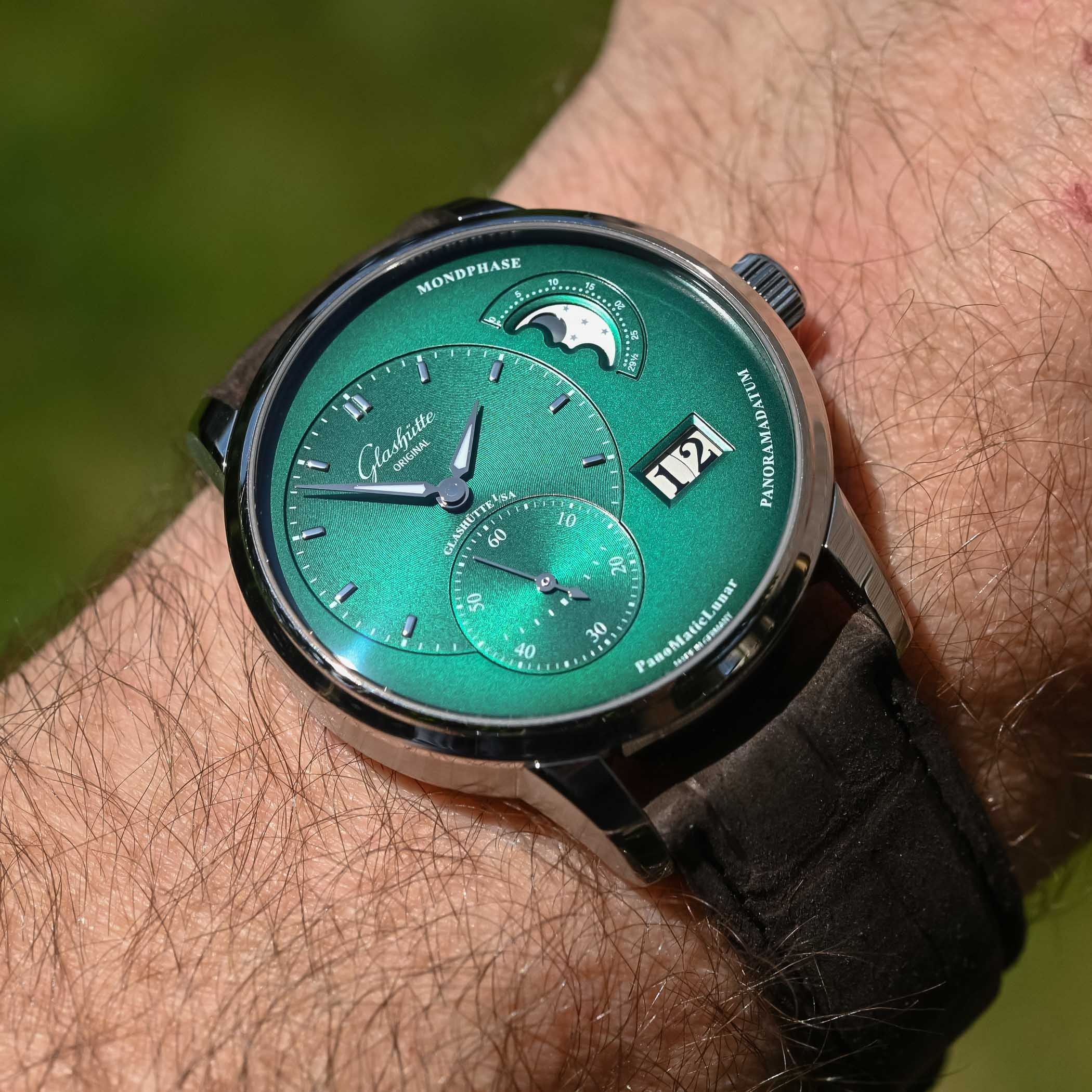 В часах PanoMaticLunar от Glashutte Original особое внимание уделено яркому, чистому дизайну с его смещенными от центра часовой и минутной стрелками и секундным дисплеем. Часовая/минутная и секундная стрелки лежат на вертикальной оси в пределах левой половины циферблата, в то время как апертура панорамной даты и индикатор фазы Луны расположены, соответственно, на нижнем и верхнем правых участках. Размещение отдельных индикаторов выполнено по принципу "Золотого сечения" – легендарного закона эстетической гармонии. Модель представлена корпусом из нержавеющей стали с зеленым циферблатом, часовой, минутной и секундной стрелками, а также 9 часовыми индексами. Эксклюзивный дисплей индикатора фаз Луны демонстрирует звезды и луну. Часы PanoMaticLunar укомплектованы механическим Калибром 90-02 – автоматическим часовым механизмом с 47 камнями и 42 часами запаса хода. Задняя сапфировая часть корпуса открывает широкий вид на изысканный часовой механизм и его характерные для Glashutte элементы: трех четвертная палета с линейными узорами Glashutte, смещенный от центра ротор из золота 21к, вороненые винты и вручную гравированный балансовый мост с регулятором «лебединая шея».