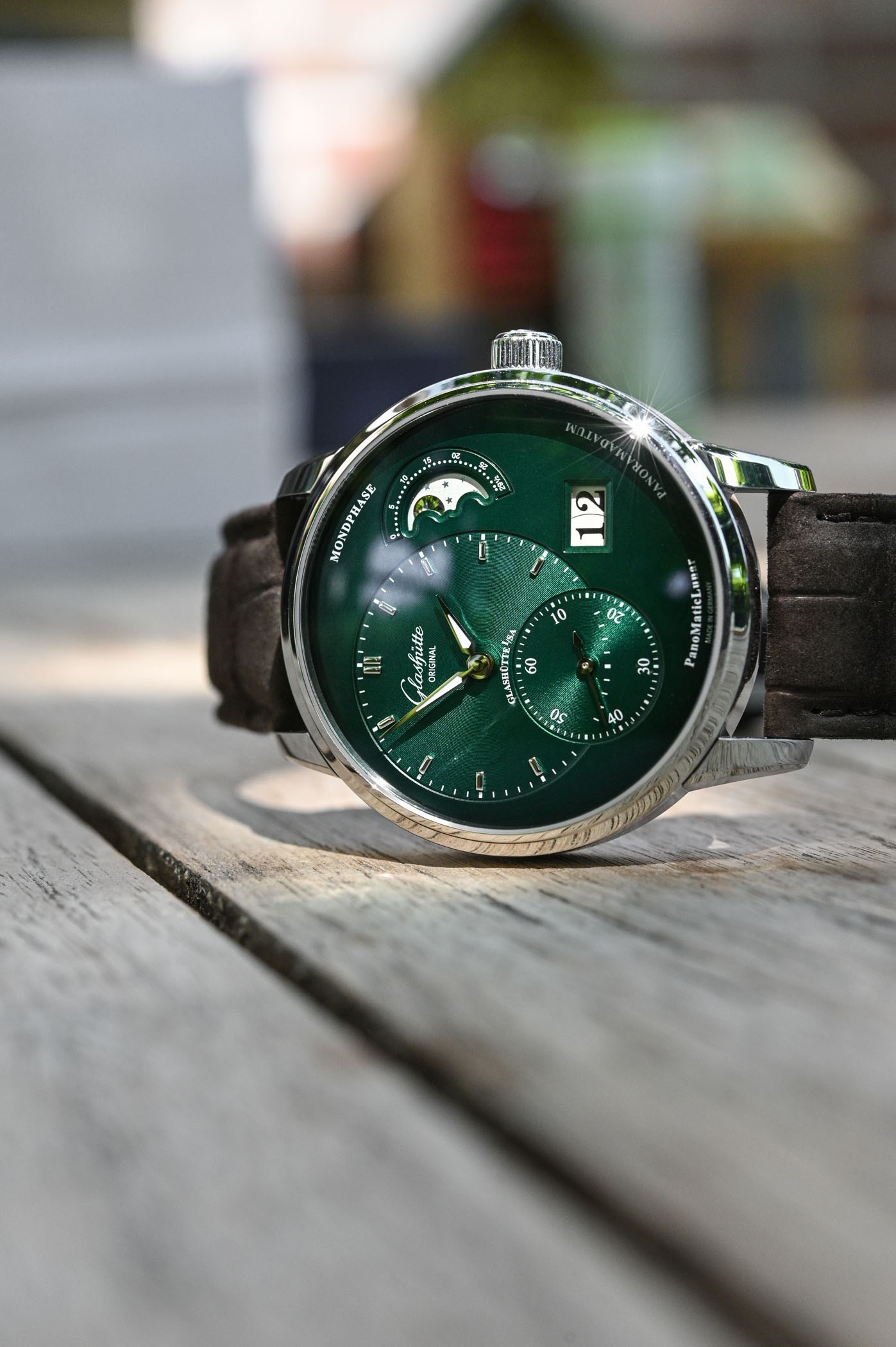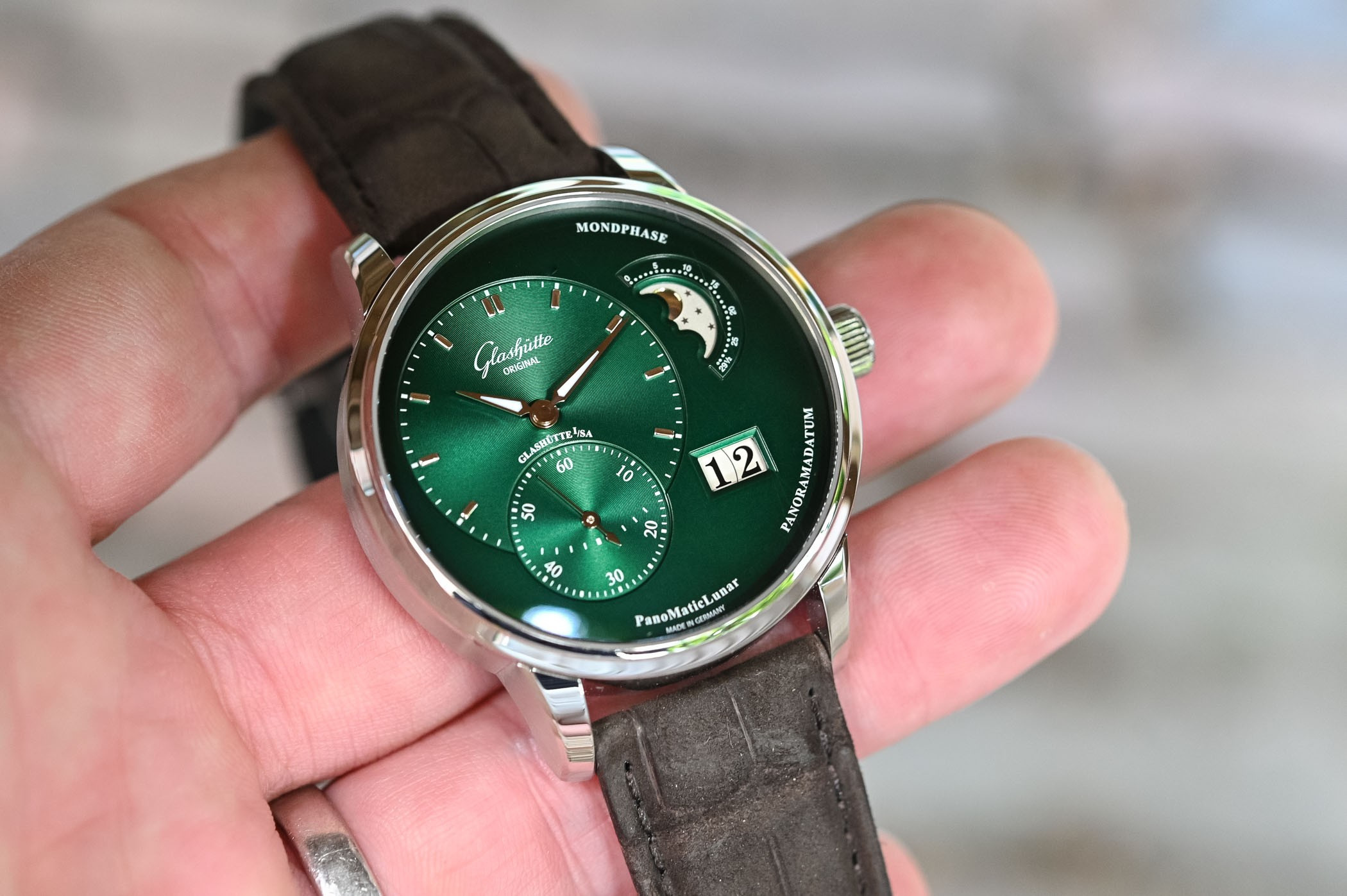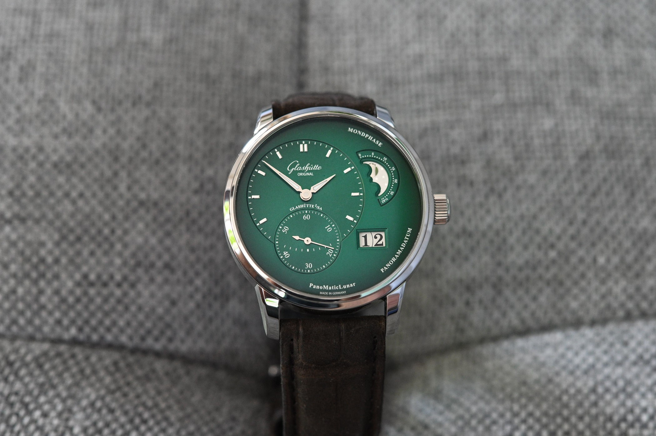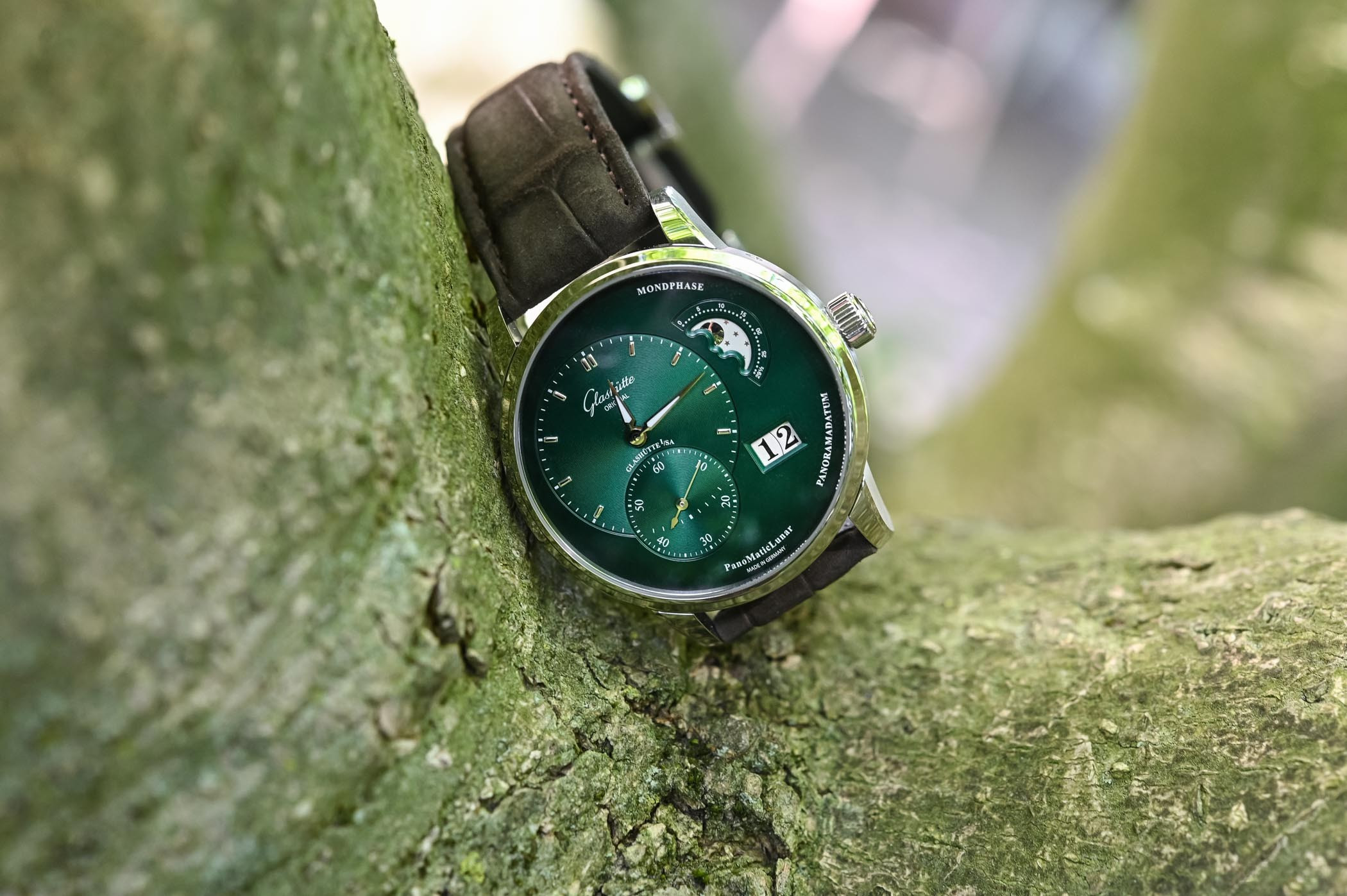 В часах PanoMaticLunar от Glashutte Original особое внимание уделено яркому, чистому дизайну с его смещенными от центра часовой и минутной стрелками и секундным дисплеем. Часовая/минутная и секундная стрелки лежат на вертикальной оси в пределах левой половины циферблата, в то время как апертура панорамной даты и индикатор фазы Луны расположены, соответственно, на нижнем и верхнем правых участках. Размещение отдельных индикаторов выполнено по принципу "Золотого сечения" – легендарного закона эстетической гармонии. Модель представлена корпусом из нержавеющей стали с зеленым циферблатом, часовой, минутной и секундной стрелками, а также 9 часовыми индексами. Эксклюзивный дисплей индикатора фаз Луны демонстрирует звезды и луну. Часы PanoMaticLunar укомплектованы механическим Калибром 90-02 – автоматическим часовым механизмом с 47 камнями и 42 часами запаса хода. Задняя сапфировая часть корпуса открывает широкий вид на изысканный часовой механизм и его характерные для Glashutte элементы: трех четвертная палета с линейными узорами Glashutte, смещенный от центра ротор из золота 21к, вороненые винты и вручную гравированный балансовый мост с регулятором «лебединая шея».