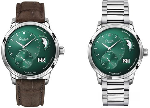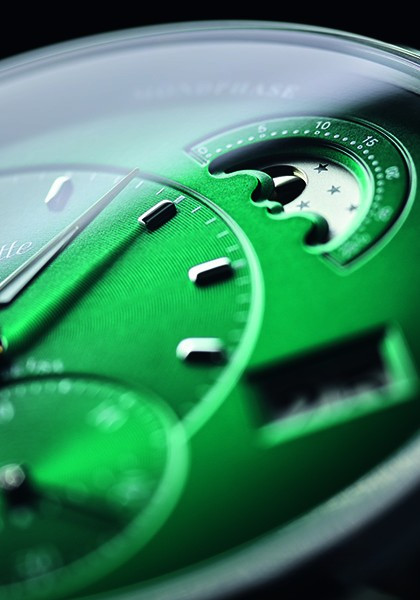 В часах PanoMaticLunar от Glashutte Original особое внимание уделено яркому, чистому дизайну с его смещенными от центра часовой и минутной стрелками и секундным дисплеем. Часовая/минутная и секундная стрелки лежат на вертикальной оси в пределах левой половины циферблата, в то время как апертура панорамной даты и индикатор фазы Луны расположены, соответственно, на нижнем и верхнем правых участках. Размещение отдельных индикаторов выполнено по принципу "Золотого сечения" – легендарного закона эстетической гармонии. Модель представлена корпусом из нержавеющей стали с зеленым циферблатом, часовой, минутной и секундной стрелками, а также 9 часовыми индексами. Эксклюзивный дисплей индикатора фаз Луны демонстрирует звезды и луну. Часы PanoMaticLunar укомплектованы механическим Калибром 90-02 – автоматическим часовым механизмом с 47 камнями и 42 часами запаса хода. Задняя сапфировая часть корпуса открывает широкий вид на изысканный часовой механизм и его характерные для Glashutte элементы: трех четвертная палета с линейными узорами Glashutte, смещенный от центра ротор из золота 21к, вороненые винты и вручную гравированный балансовый мост с регулятором «лебединая шея».