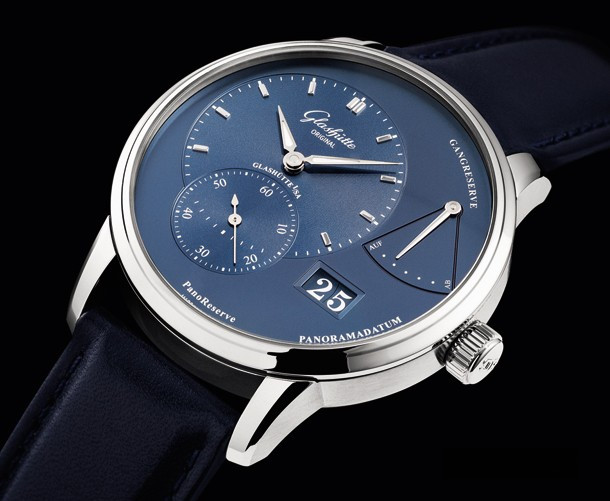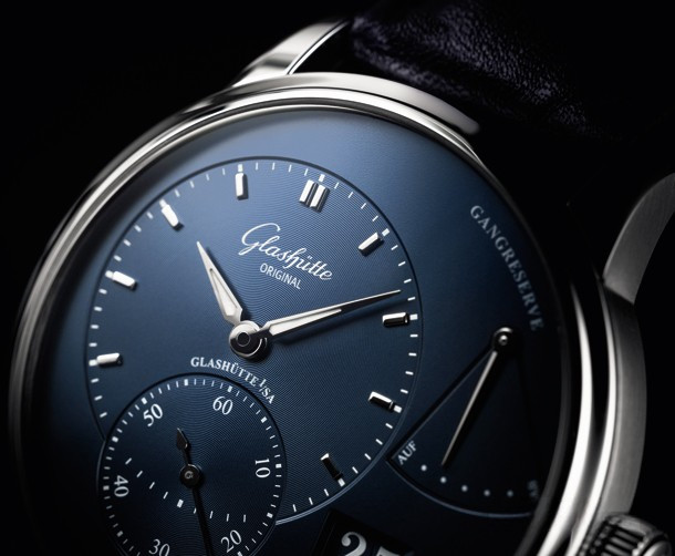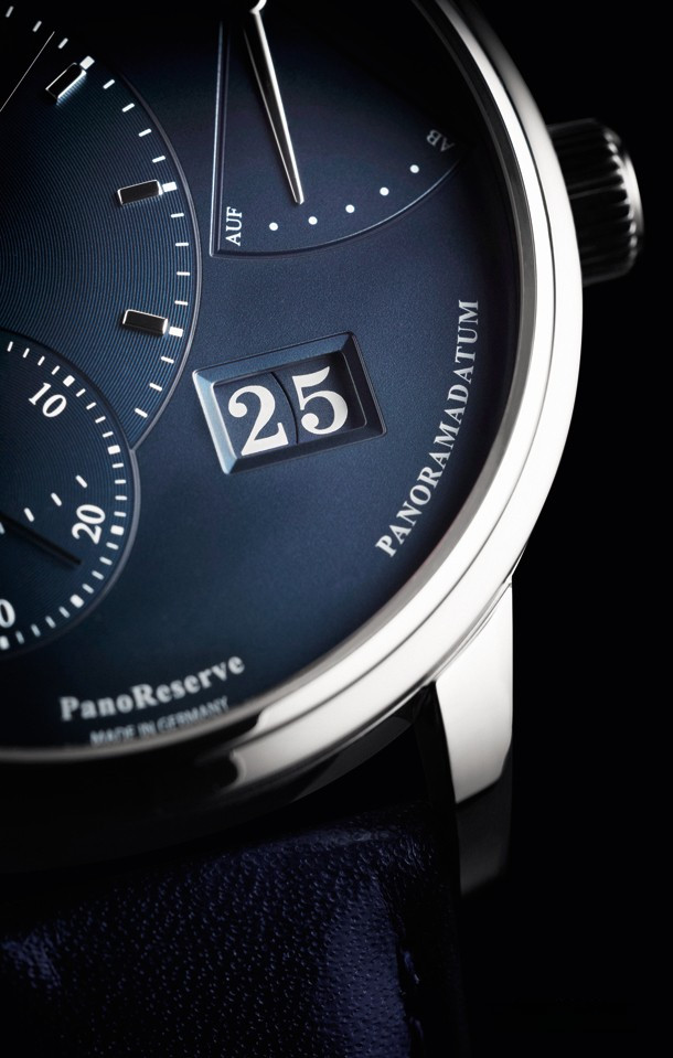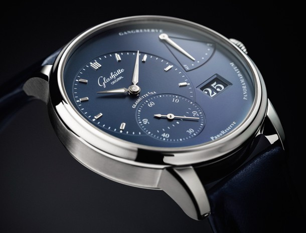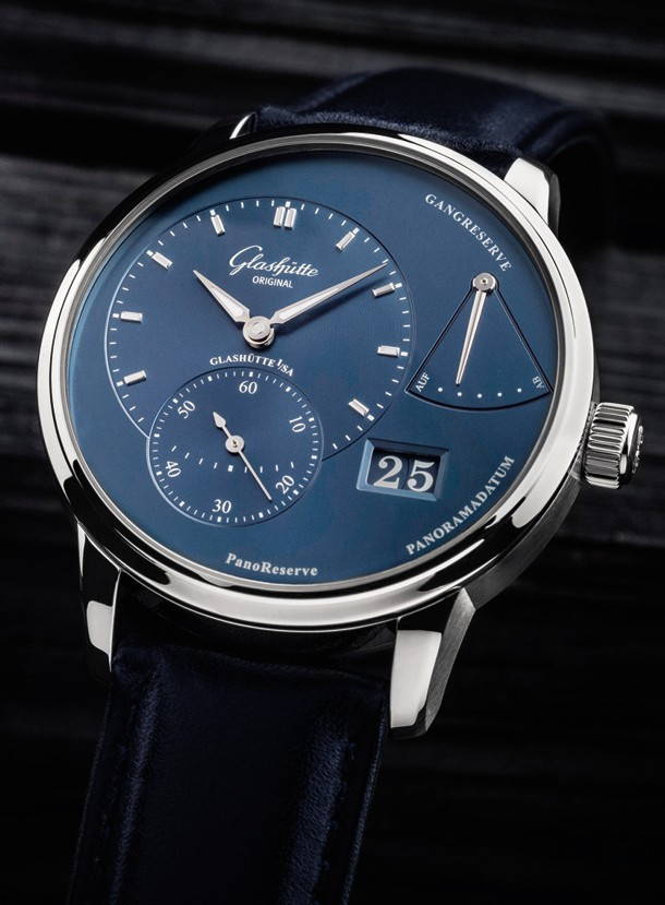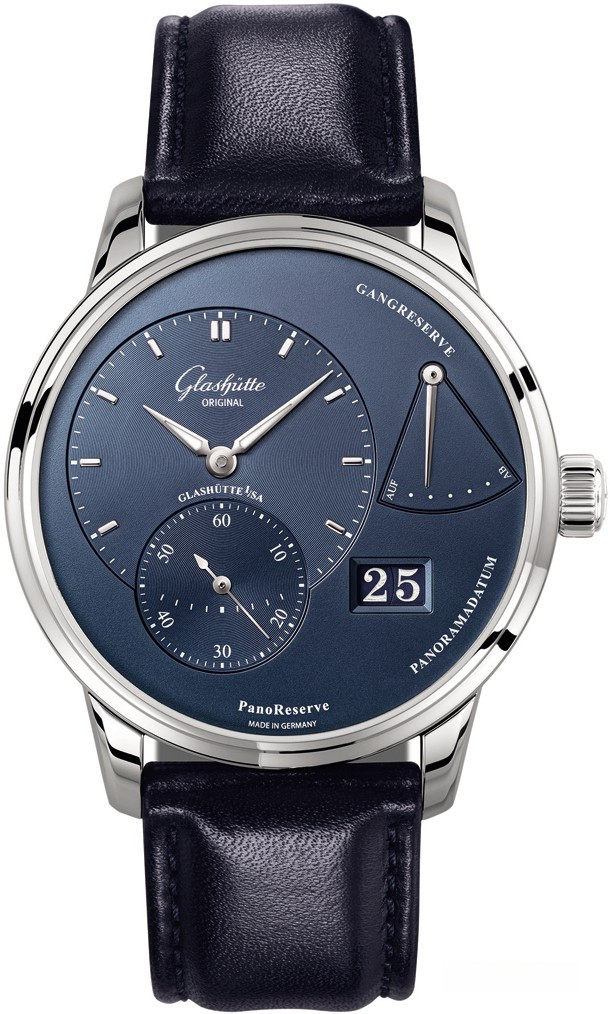 Модель PanoReserve из нержавеющей стали имеет синий циферблат со стрелками из белого золота, часовыми маркерами и впечатляющим индикатором панорамной даты с белыми на синем фоне цифрами под индикатором запаса хода. В интересах повышения читабельности в темноте, часы имеют люминесцентное покрытие на часовых и минутных стрелках. Сердце PanoReserve – Калибр 65-01 с ручным заводом, 42 часами запаса хода и 48 камнями. Задняя сапфировая часть корпуса отчетливо демонстрирует характерный для Glashutte Original регулятор «лебединая шея» с дуплексной передачей и другие традиционные элементы Glashutte: трех четвертная палета с линейными узорами Glashutte, балансовый мост с ручной гравировкой, балансовые винты, резьбовые золотые гнезда для вороненых винтов. Индикаторы панорамной даты, фазы Луны и запаса хода нанесены на немецком языке. Наряду с отметкой "Made in Germany" эти показания являются тонким напоминанием о происхождении часов и отдают тихий поклон искусству немецкого часового производства, практикуемого в Glashutte с 1845 года.