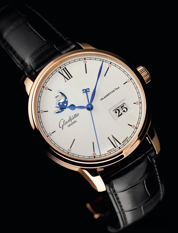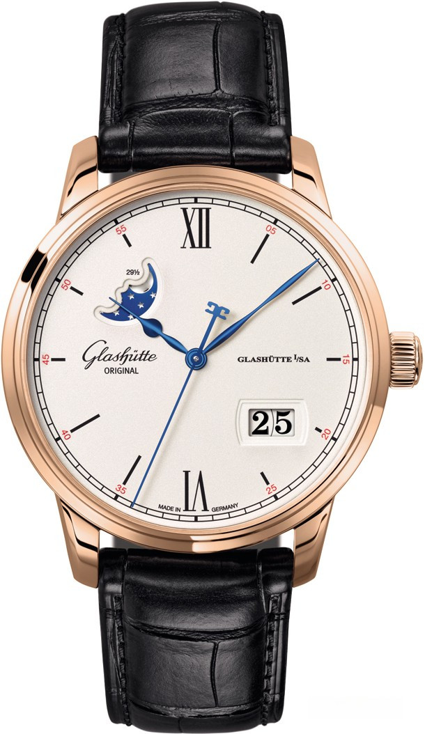 Модель Senator Excellence Panorama Date Moon Phase оснащена указателем даты и еще одним характерным усложнением марки Glashütte Original: указателем фазы Луны. Серебристая луна появляется в округлом окошке циферблата между отметками «10» и «11 часов». Элегантный диск Луны эффектно выделяется на фоне звездного неба насыщенного синего цвета.Высочайшие стандарты качества, заданные новым Калибром 36 марки Glashütte Original, несомненно оказали решающее влияние на конструкцию обоих усложнений – панорамной даты и указателя фазы Луны.Часы представлены в корпусе диаметром 40 мм, выполненном из розового золота, в отделке которого сочетаются полированные и сатинированные поверхности. Грушевидные стрелки из вороненой стали и филигранная секундная стрелка позволяют с легкостью считывать показания.Часы оснащены черным ремешком из кожи Луизианского аллигатора с классической застежкой.