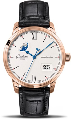 Модель Senator Excellence Panorama Date Moon Phase оснащена указателем даты и еще одним характерным усложнением марки Glashütte Original: указателем фазы Луны. Серебристая луна появляется в округлом окошке циферблата между отметками «10» и «11 часов». Элегантный диск Луны эффектно выделяется на фоне звездного неба насыщенного синего цвета. Высочайшие стандарты качества, заданные новым Калибром 36 марки Glashütte Original, несомненно оказали решающее влияние на конструкцию обоих усложнений – панорамной даты и указателя фазы Луны.Часы представлены в корпусе диаметром 40 мм, выполненном из розового золота 18к, в отделке которого сочетаются полированные и сатинированные поверхности. Грушевидные стрелки из вороненой стали и филигранная секундная стрелка позволяют с легкостью считывать показания. Часы оснащены черным ремешком из кожи Луизианского аллигатора с классической застежкой.