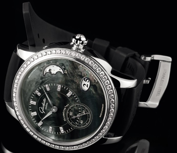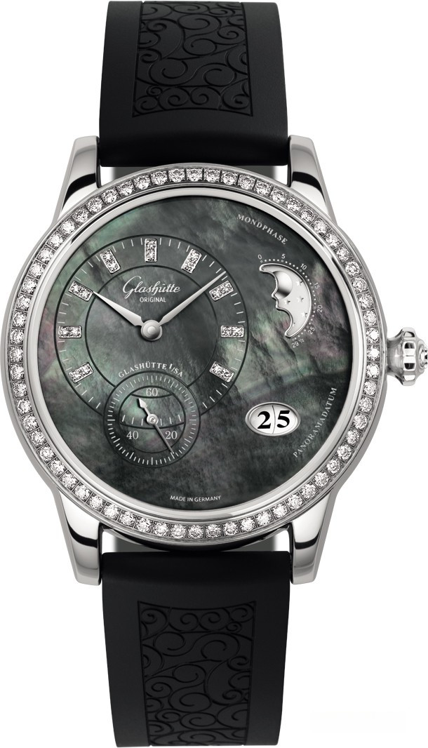 Вдохновленные лунной символикой, Glashütte Original создали модель PanoMatic Luna. Элегантный дисплей индикатора лунной фазы представляет сияющую серебристую луну и звезды на фоне ночного неба. На 4-х часах помещен индикатор панорамной даты, а завершающим штрихом является изящный 3,0 миллиметровый бриллиант на заводной головке. В корпус из нержавеющей стали размером 39.3 х 12 мм деликатно помещен автоматический мануфактурный механизм с запасом хода 42 часа. Часы комплектуются черным каучуковым ремешком с застежкой из нержавеющей стали.