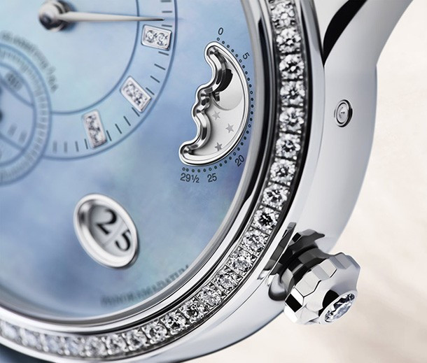 Очаровательный, нежный синий перламутровый циферблат украшает женскую модель PanoMatic Luna. Перламутр собирают из внутреннего слоя раковины некоторых моллюсков. Для достижения желаемого оттенка задняя часть тонкого белого исходного материала тщательно покрывается слоем лака. Циферблат обладает неповторимой естественной зернистостью перламутра, что делает каждый экземпляр часов абсолютно уникальным. Циферблат, безель и коронку часов украшают белые бриллианты. Индикатор панорамной даты обрамлен овальной рамкой. Элегантность PanoMatic Luna дополняется ремешком из кожи луизианского аллигатора. Корпус размером 39.4 мм изготовлен из нержавеющей стали. Часы комплектуются автоматическим механизмом с запасом хода 42 часа.