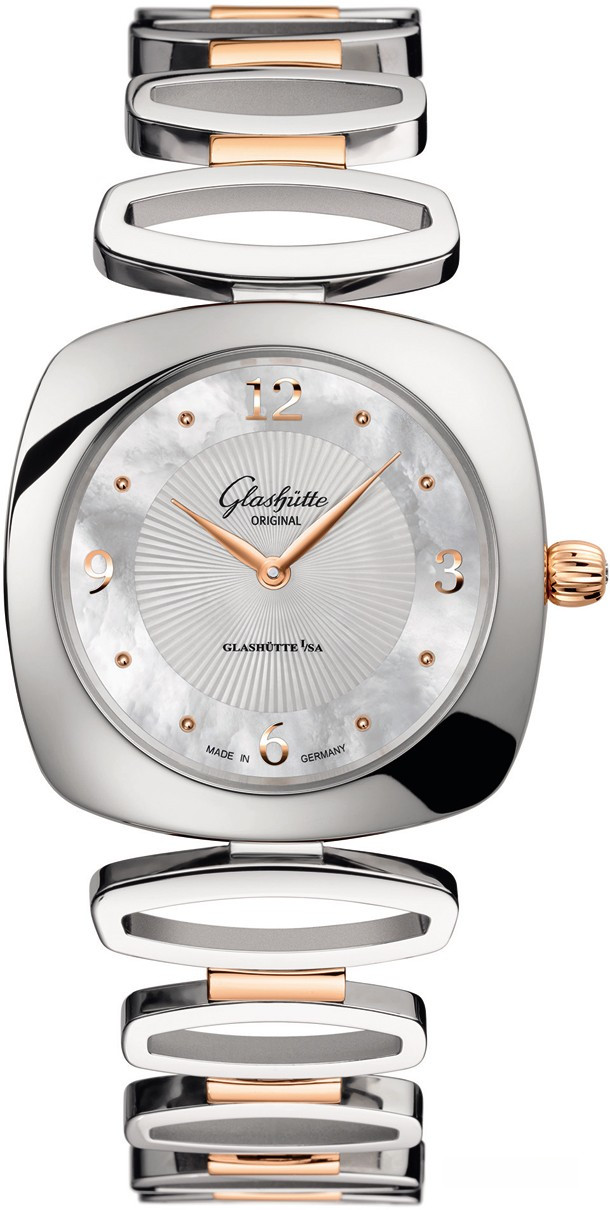 Эти роскошные женские часы имеют характерную форму «кушон» (или подушка) популярную в 1920-е. Корпус з нержавеющей стали и розового золота 18к обладает размером 31 х 31 х 7.5 мм. На белом жемчужном гильошированном циферблате отображаются часы и минуты. Течение времени олицетворяет движение филигранно выполненных стрелок в форме листка, которые изящно скользят вдоль часовых меток. В этой модели узнаваемый логотип «Glashütte Original» нанесен на внутреннюю сторону сапфирового стекла и словно парит над поверхностью циферблата. Часы комплектуются браслетом из нержавеющей стали и розового золота 18к.