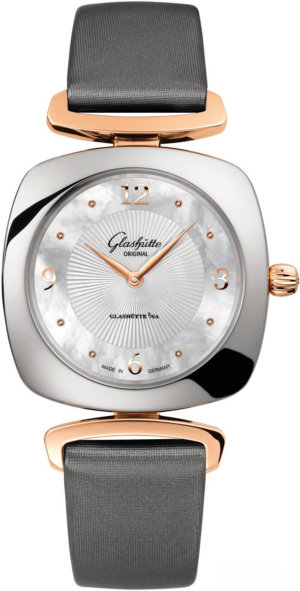 Эти роскошные женские часы имеют характерную форму «кушон» (или подушка) популярную в 1920-е. Корпус з нержавеющей стали и розового золота 18к обладает размером 31 х 31 х 7.5 мм. На белом жемчужном гильошированном циферблате отображаются часы и минуты. Течение времени олицетворяет движение филигранно выполненных стрелок в форме листка, которые изящно скользят вдоль часовых меток. В этой модели узнаваемый логотип «Glashütte Original» нанесен на внутреннюю сторону сапфирового стекла и словно парит над поверхностью циферблата. Часы комплектуются серым атласным ремешком с вставкой из нержавеющей стали.