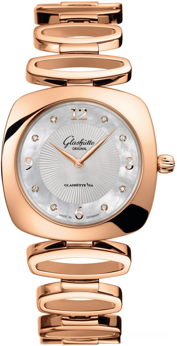 Эти роскошные женские часы имеют характерную форму «кушон» (или подушка) популярную в 1920-е. Белые бриллианты плавными линиями вторят форме великолепного корпуса из розового золота. Повторение характерного контура кушон можно найти и в центре перламутрового циферблата в обрамлении изысканного гильоше: 8 бриллиантов круглой огранки были установлены на циферблат вручную в стенах принадлежащей саксонской компании фабрике циферблатов. Течение времени олицетворяет движение филигранно выполненных стрелок в форме листка, которые изящно скользят вдоль часовых меток, роль которых исполняют великолепные бриллианты круглой огранки. В этой сверкающей модели узнаваемый логотип «Glashütte Original» нанесен на внутреннюю сторону сапфирового стекла и словно парит над поверхностью циферблата.