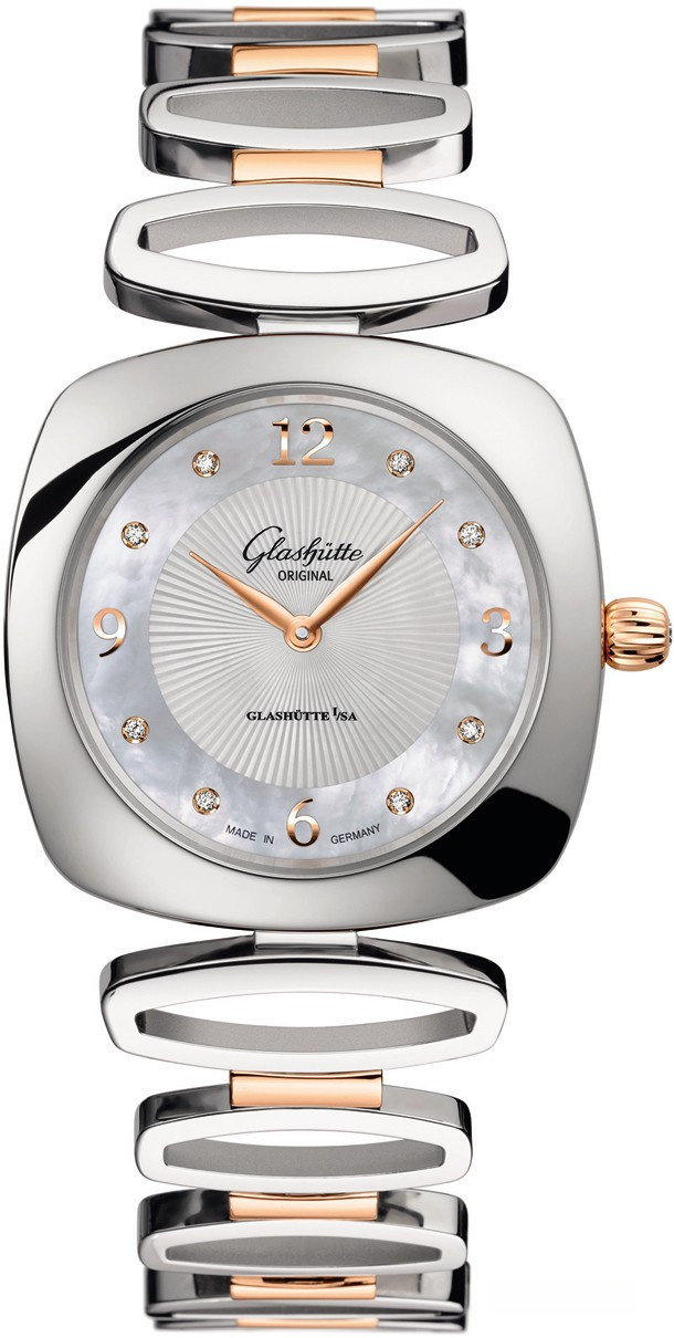Эти роскошные женские часы имеют характерную форму «кушон» (или подушка) популярную в 1920-е. Белые бриллианты плавными линиями вторят форме великолепного корпуса из нержавеющей стали и розового золота. На белом жемчужном гильошированном циферблате закреплены 8 бриллиантов круглой огранки вручную в стенах принадлежащей саксонской компании фабрике циферблатов. Течение времени олицетворяет движение филигранно выполненных стрелок в форме листка, которые изящно скользят вдоль часовых меток, роль которых исполняют великолепные бриллианты круглой огранки. В этой сверкающей модели узнаваемый логотип «Glashütte Original» нанесен на внутреннюю сторону сапфирового стекла и словно парит над поверхностью циферблата.
