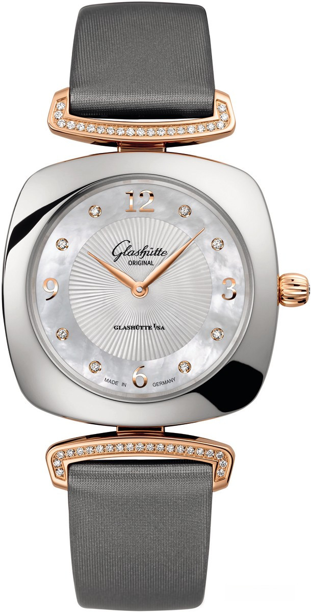 Эти роскошные женские часы имеют характерную форму «кушон» (или подушка) популярную в 1920-е. Белые бриллианты плавными линиями вторят форме великолепного корпуса из нержавеющей стали и розового золота. На белом жемчужном гильошированном циферблате закреплены 8 бриллиантов круглой огранки вручную в стенах принадлежащей саксонской компании фабрике циферблатов. Течение времени олицетворяет движение филигранно выполненных стрелок в форме листка, которые изящно скользят вдоль часовых меток, роль которых исполняют великолепные бриллианты круглой огранки. В этой сверкающей модели узнаваемый логотип «Glashütte Original» нанесен на внутреннюю сторону сапфирового стекла и словно парит над поверхностью циферблата.