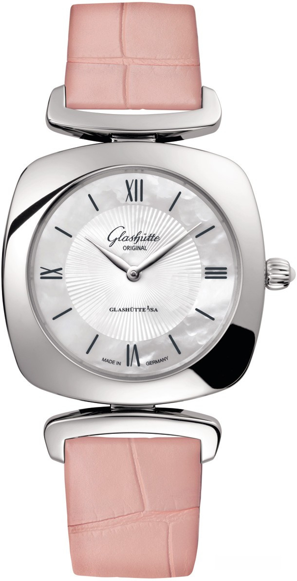 Эти роскошные женские часы имеют характерную форму «кушон» (или подушка) популярную в 1920-е. Корпус из нержавеющей стали обладает размером 31 х 31 х 7.5 мм. На белом жемчужном гильошированном циферблате отображаются часы и минуты. Течение времени олицетворяет движение филигранно выполненных стрелок в форме листка, которые изящно скользят вдоль часовых меток. В этой модели узнаваемый логотип «Glashütte Original» нанесен на внутреннюю сторону сапфирового стекла и словно парит над поверхностью циферблата. Часы комплектуются ремешком из кожи аллигатора с вставкой из нержавеющей стали.