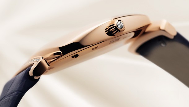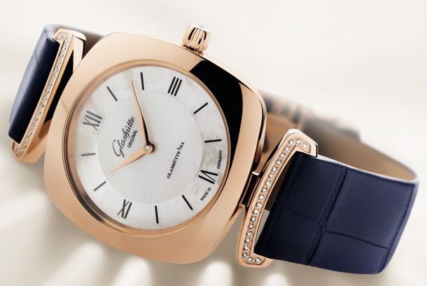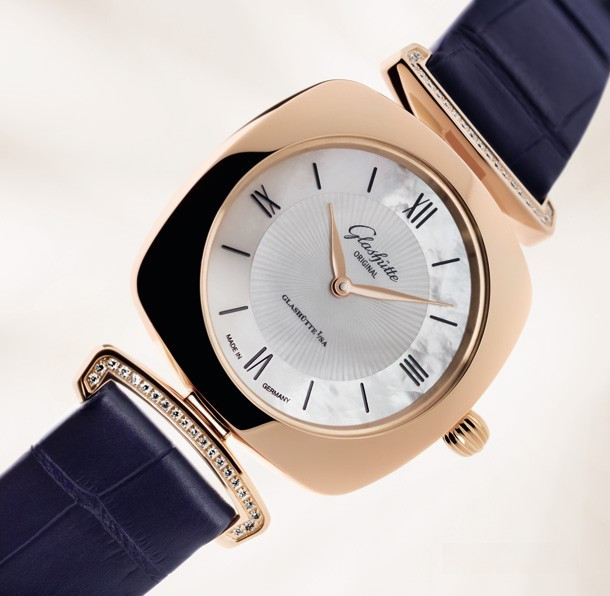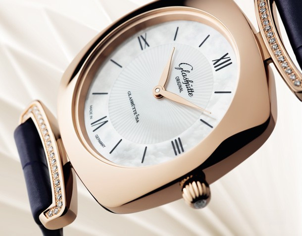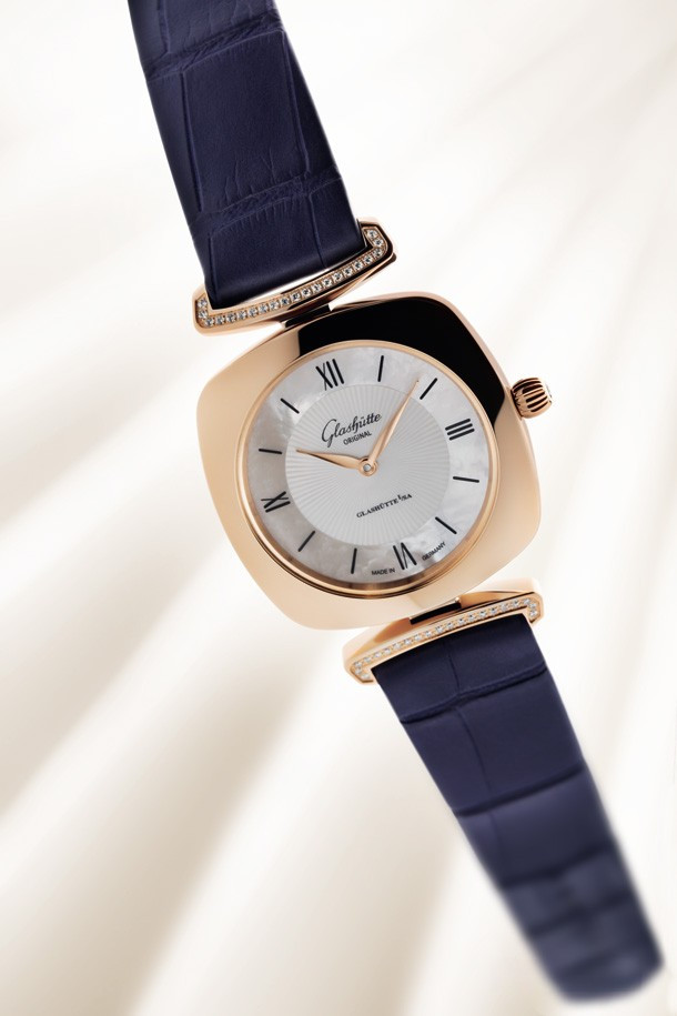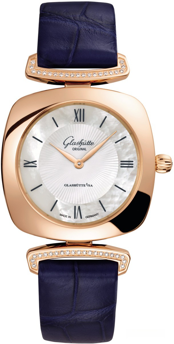 Эти роскошные женские часы имеют характерную форму «кушон» (или подушка) популярную в 1920-е. Корпус из розового золота 18к обладает размером 31 х 31 х 7.5 мм. На белом жемчужном гильошированном циферблате отображаются часы и минуты. Течение времени олицетворяет движение филигранно выполненных стрелок в форме листка, которые изящно скользят вдоль часовых меток. В этой модели узнаваемый логотип «Glashütte Original» нанесен на внутреннюю сторону сапфирового стекла и словно парит над поверхностью циферблата. Часы комплектуются ремешком из кожи аллигатора с золотой застежкой. Корпус инкрустирован белыми бриллиантами.