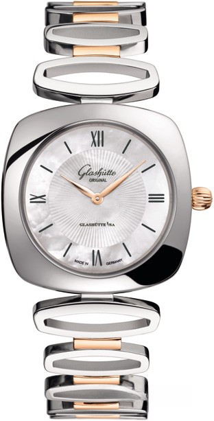 Эти роскошные женские часы имеют характерную форму «кушон» (или подушка) популярную в 1920-е. Корпус из нержавеющей стали и розового золота 18к обладает размером 31 х 31 х 7.5 мм. На белом жемчужном гильошированном циферблате отображаются часы и минуты. Течение времени олицетворяет движение филигранно выполненных стрелок в форме листка, которые изящно скользят вдоль часовых меток. В этой модели узнаваемый логотип «Glashütte Original» нанесен на внутреннюю сторону сапфирового стекла и словно парит над поверхностью циферблата. Часы комплектуются браслетом из нержавеющей стали и розового золота 18к.