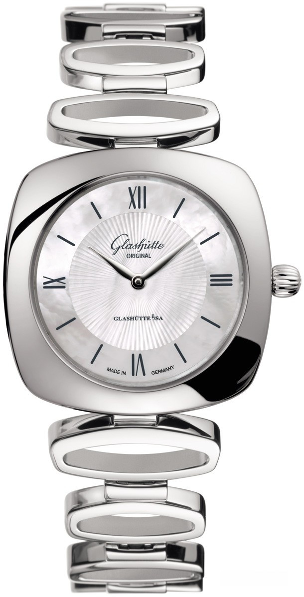 Эти роскошные женские часы имеют характерную форму «кушон» (или подушка) популярную в 1920-е. Корпус из нержавеющей стали обладает размером 31 х 31 х 7.5 мм. На белом жемчужном гильошированном циферблате отображаются часы и минуты. Течение времени олицетворяет движение филигранно выполненных стрелок в форме листка, которые изящно скользят вдоль часовых меток. В этой модели узнаваемый логотип «Glashütte Original» нанесен на внутреннюю сторону сапфирового стекла и словно парит над поверхностью циферблата. Часы комплектуются браслетом из нержавеющей стали.