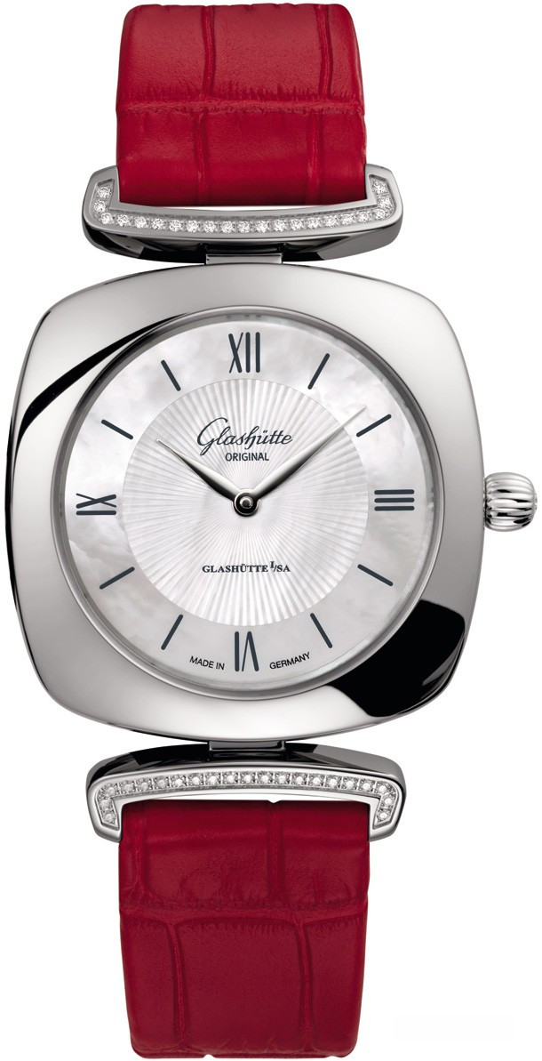 Эти роскошные женские часы имеют характерную форму «кушон» (или подушка) популярную в 1920-е. Корпус из нержавеющей стали обладает размером 31 х 31 х 7.5 мм. На белом жемчужном гильошированном циферблате отображаются часы и минуты. Течение времени олицетворяет движение филигранно выполненных стрелок в форме листка, которые изящно скользят вдоль часовых меток. В этой модели узнаваемый логотип «Glashütte Original» нанесен на внутреннюю сторону сапфирового стекла и словно парит над поверхностью циферблата. Часы комплектуются ремешком из кожи аллигатора с вставкой из нержавеющей стали. Корпус инкрустирован белыми бриллиантами.