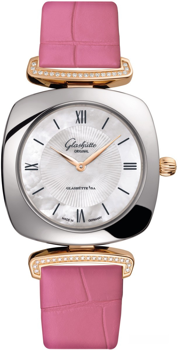 Эти роскошные женские часы имеют характерную форму «кушон» (или подушка) популярную в 1920-е. Корпус из нержавеющей стали и розового золота 18к обладает размером 31 х 31 х 7.5 мм. На белом жемчужном гильошированном циферблате отображаются часы и минуты. Течение времени олицетворяет движение филигранно выполненных стрелок в форме листка, которые изящно скользят вдоль часовых меток. В этой модели узнаваемый логотип «Glashütte Original» нанесен на внутреннюю сторону сапфирового стекла и словно парит над поверхностью циферблата. Часы комплектуются ремешком из кожи аллигатора с вставкой из нержавеющей стали. Корпус инкрустирован белыми бриллиантами.
