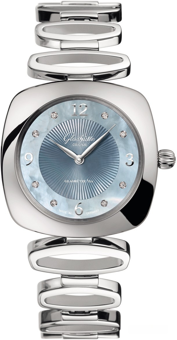 Эти роскошные женские часы имеют характерную форму «кушон» (или подушка) популярную в 1920-е. Корпус з нержавеющей стали обладает размером 31 х 31 х 7.5 мм. На голубом жемчужном гильошированном циферблате отображаются часы и минуты. Течение времени олицетворяет движение филигранно выполненных стрелок в форме листка, которые изящно скользят вдоль часовых меток, 8 из которых являются белыми бриллиантами. В этой модели узнаваемый логотип «Glashütte Original» нанесен на внутреннюю сторону сапфирового стекла и словно парит над поверхностью циферблата. Часы комплектуются браслетом из нержавеющей стали.