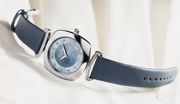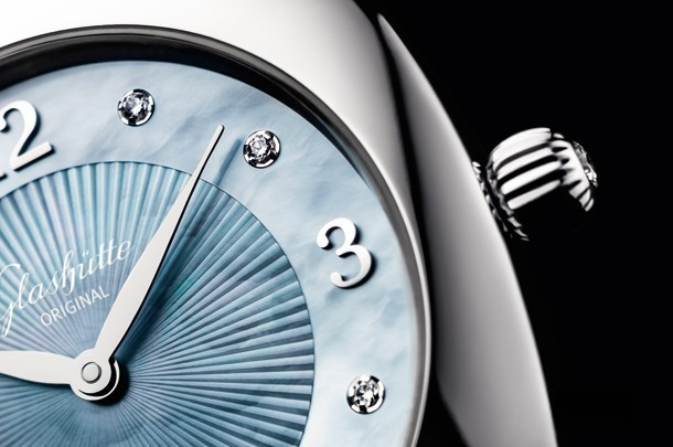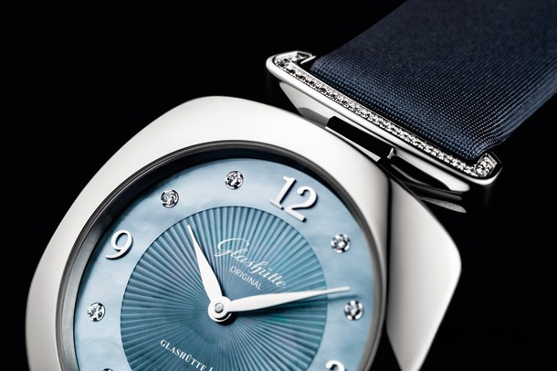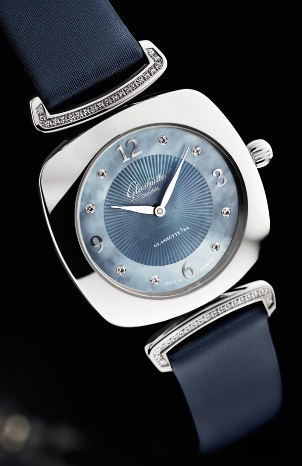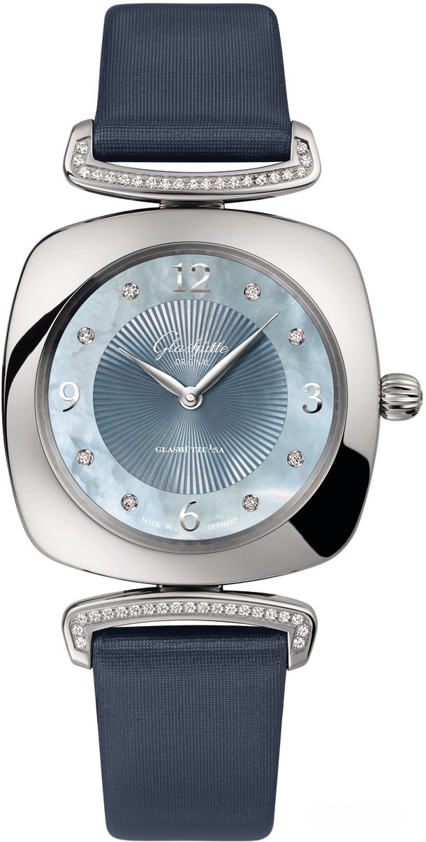 Эти роскошные женские часы имеют характерную форму «кушон» (или подушка) популярную в 1920-е. Корпус з нержавеющей стали обладает размером 31 х 31 х 7.5 мм. На голубом жемчужном гильошированном циферблате отображаются часы и минуты. Течение времени олицетворяет движение филигранно выполненных стрелок в форме листка, которые изящно скользят вдоль часовых меток, 8 из которых являются белыми бриллиантами. В этой модели узнаваемый логотип «Glashütte Original» нанесен на внутреннюю сторону сапфирового стекла и словно парит над поверхностью циферблата. Часы комплектуются атласным ремешком с вставкой из нержавеющей стали.