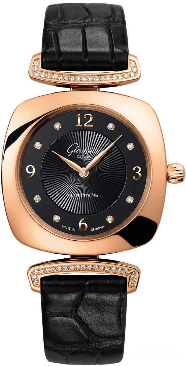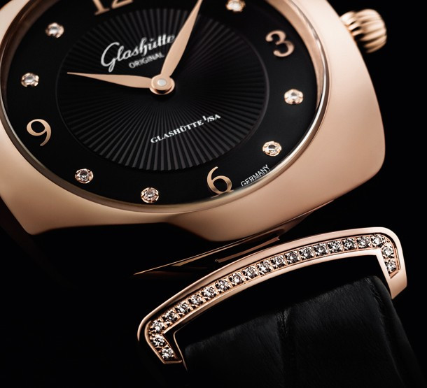 Эти роскошные женские часы имеют характерную форму «кушон» (или подушка) популярную в 1920-е. Белые бриллианты плавными линиями вторят форме великолепного корпуса из розового золота. Повторение характерного контура кушон можно найти и в центре черного гильошированного циферблата, 8 бриллиантов круглой огранки были установлены на циферблат вручную в стенах принадлежащей саксонской компании фабрике циферблатов. Течение времени олицетворяет движение филигранно выполненных стрелок в форме листка, которые изящно скользят вдоль часовых меток, роль которых исполняют великолепные бриллианты круглой огранки. В этой сверкающей модели узнаваемый логотип «Glashütte Original» нанесен на внутреннюю сторону сапфирового стекла и словно парит над поверхностью циферблата.