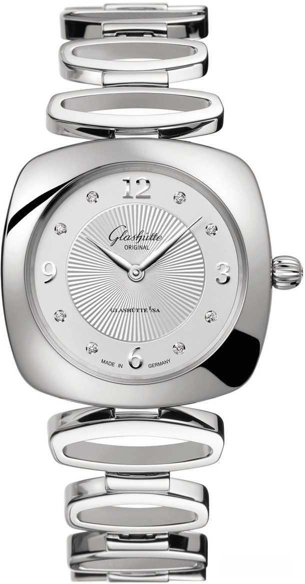 Эти роскошные женские часы имеют характерную форму «кушон» (или подушка) популярную в 1920-е. Корпус з нержавеющей стали обладает размером 31 х 31 х 7.5 мм. На серебристом гильошированном циферблате отображаются часы и минуты. Течение времени олицетворяет движение филигранно выполненных стрелок в форме листка, которые изящно скользят вдоль часовых меток, 8 из которых являются белыми бриллиантами. В этой модели узнаваемый логотип «Glashütte Original» нанесен на внутреннюю сторону сапфирового стекла и словно парит над поверхностью циферблата. Часы комплектуются браслетом из нержавеющей стали.