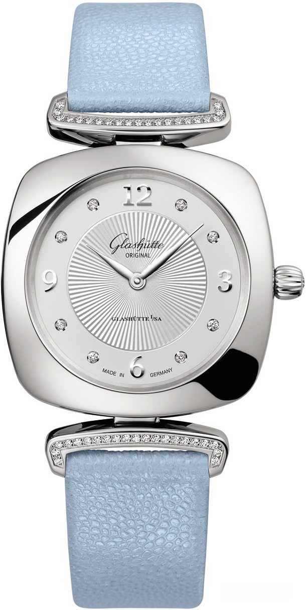 Эти роскошные женские часы имеют характерную форму «кушон» (или подушка) популярную в 1920-е. Корпус з нержавеющей стали обладает размером 31 х 31 х 7.5 мм. На серебристом гильошированном циферблате отображаются часы и минуты. Течение времени олицетворяет движение филигранно выполненных стрелок в форме листка, которые изящно скользят вдоль часовых меток, 8 из которых являются белыми бриллиантами. В этой модели узнаваемый логотип «Glashütte Original» нанесен на внутреннюю сторону сапфирового стекла и словно парит над поверхностью циферблата. Часы комплектуются кожаным ремешком с вставкой из нержавеющей стали.