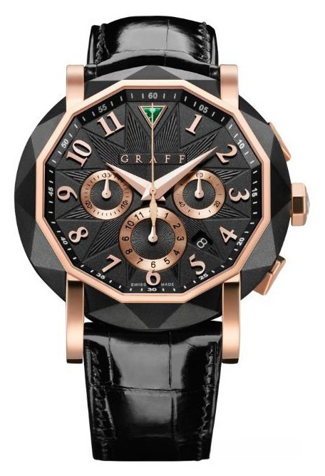 Часы Graff ChronoGraff 42 mm представлены в корпусе из розового золота 18к с черным DLC размером 42 мм водонепроницаемостью 30 метров. Внутри корпуса находится автоматический механизм. На черном циферблате отображаются часы, минуты, секунды, дата, накопители хронографа.Часы поставляются на ремешке из кожи аллигатора с золотой застежкой.