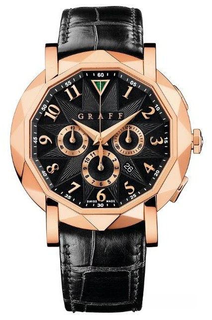 Часы Graff ChronoGraff 42 mm представлены в корпусе из розового золота 18к размером 42 мм водонепроницаемостью 30 метров. Внутри корпуса находится автоматический механизм. На черном циферблате отображаются часы, минуты, секунды, дата, накопители хронографа.Часы поставляются на ремешке из кожи аллигатора с золотой застежкой.