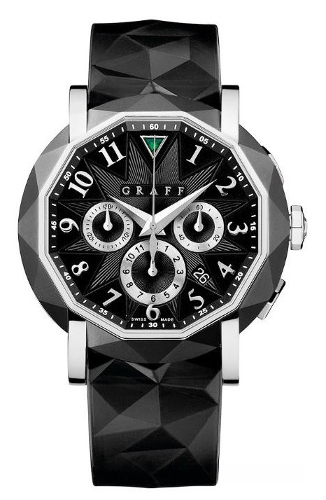 Часы Graff ChronoGraff 45 mm представлены в корпусе из белого золота 18к с покрытием DLC размером 45 мм водонепроницаемостью 30 метров. Внутри корпуса находится автоматический механизм. На черном циферблате отображаются часы, минуты, секунды, дата, накопители хронографа.Часы поставляются на каучуковом ремешке с золотой застежкой.