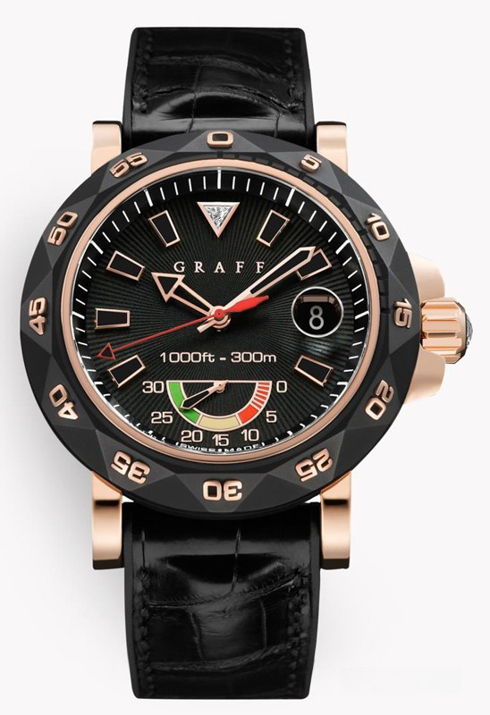 Часы Graff Scuba представлены в корпусе из розового золота 18к с покрытием DLC размером 47 мм водонепроницаемостью 30 метров. Внутри корпуса находится автоматический механизм. На черном циферблате отображаются часы, минуты, секунды, дата, запас хода.Часы поставляются на ремешке из кожи аллигатора с золотой застежкой.