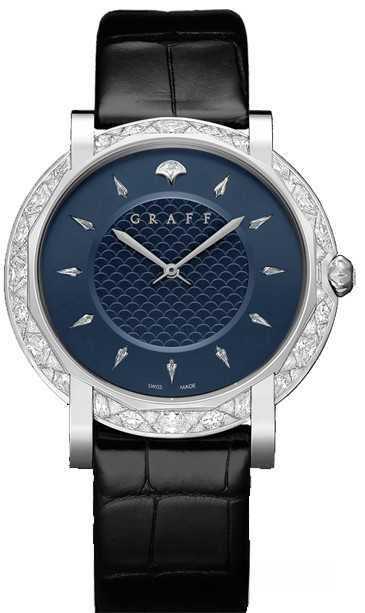 Часы Graff Slim 43 mm представлены в корпусе из белого золота 18к размером 43 мм и водонепроницаемостью 30 м. Внутри корпуса установлен автоматический механизм, Калибр Graff 3, обладающий запасом хода 48 часов. На синем гильошированном циферблате отображаются часы и минуты. Часы комплеткуются ремешком из кожи аллигатора с вставкой из белого золота 18к. Безель из белых бриллиантов.