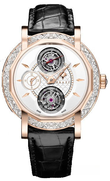 Часы Graff Double Tourbillon GMT 47 mm представлены в корпусе из розового золота 18к размером 47 мм и водонепроницаемостью 30 м. Внутри корпуса установлен механизм с ручным заводом, обладающий запасом хода 72 часа. На белом циферблате отображаются часы, минуты, секунды, время второго часового пояса, турбийон. Часы комплектуются ремешком из кожи аллигатора с вставкой из розового золота 18к. Безель из белых бриллиантов.