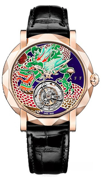 Часы Graff Metiers d'Art 43 mm представлены в корпусе из розового золота 18к размером 43 мм и водонепроницаемостью 50 мм. Внутри корпуса установлен механизм с ручным заводом, обладающим запасом хода 65 часов. На синем циферблате с изображением дракона отображаются часы и минуты, на 6-ти часах находится парящий турбийон. Часы комплеткуются ремешком из кожи аллигатора с вставкой из розового золота 18к.