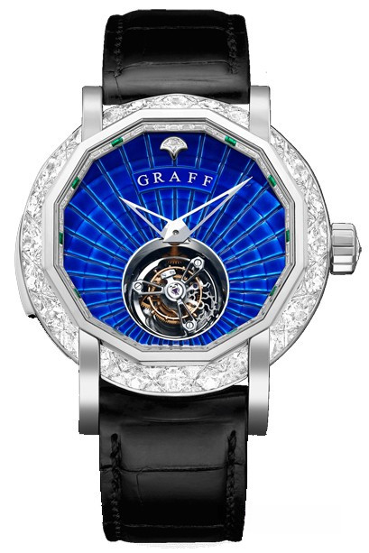 Часы Graff Minute Repeater 47 mm представлены в корпусе из белого золота 18к размером 47 мм и водонепроницаемостью 30 м. Внутри корпуса установлен механизм с ручным заводом, обладающий запасом хода 80 часов. На синем жемчужном циферблате отображаются часы и минуты, клеть турбийона на 6-ти часах. Модель усложнена функцией минутного репетира. Часы комплектуются ремешком из кожи аллигатора с вставкой из белого золота 18к. Безель из белых бриллиантов.