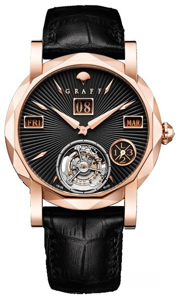 Часы Graff Mastergraff Perpetual Calendar 46mm представлены в корпусе из розового золота 18к размером 46 мм и водонепроницаемостью 30 м. Внутри корпуса установлен автоматический механизм, Калибр Graff 7, обладающий запасом хода 42 часа. На черном гильошированном циферблате отображаются часы, минуты, дата, день недели, месяц, цикл високосного года. Часы комплектуются ремешком из кожи аллигатора с вставкой из розового золота 18к.