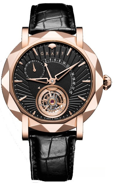 Часы Graff Mastergraff Tourbillon GMT 47mm представлены в корпусе из розового золота 18к размером 47 мм и водонепроницаемостью 30 м. Внутри корпуса установлен автоматический механизм, обладающий запасом хода 72 часа. На черном гильошированном циферблате отображаются часы, минуты, секунды и дата, время второго часового пояса, турбийон. Часы комплектуются ремешком из кожи аллигатора с вставкой из розового золота 18к.