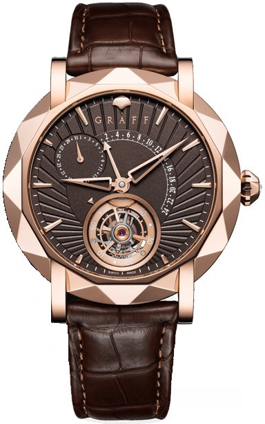 Часы Graff Mastergraff Tourbillon GMT 47mm представлены в корпусе из розового золота 18к размером 47 мм и водонепроницаемостью 30 м. Внутри корпуса установлен автоматический механизм, обладающий запасом хода 72 часа. На коричневом гильошированном циферблате отображаются часы, минуты, секунды и дата, время второго часового пояса, турбийон. Часы комплектуются ремешком из кожи аллигатора с вставкой из розового золота 18к.