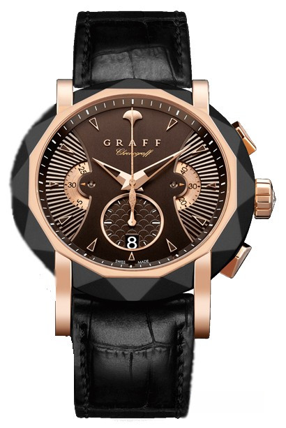 Часы Graff Chronograff 45 mm представлены в корпусе из розового золота 18к с покрытием DLC размером 45 мм и водонепроницаемостью 30 м. Внутри корпуса установлен автоматический механизм, обладающий запасом хода 42 часа. На коричневом циферблате отображаются часы, минуты, секунды, дта, накопители хронографа. Часы комплеткуются ремешком из кожи аллигатора с вставкой из розового золота 18к.