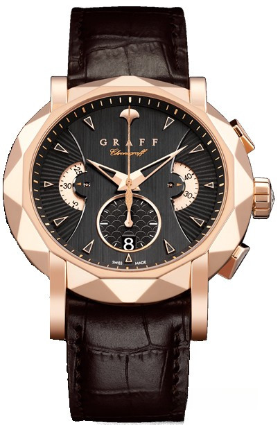 Часы Graff Chronograff 45 mm представлены в корпусе из розового золота 18к размером 45 мм и водонепроницаемостью 30 м. Внутри корпуса установлен автоматический механизм, обладающий запасом хода 42 часа. На черном циферблате отображаются часы, минуты, секунды, дта, накопители хронографа. Часы комплеткуются ремешком из кожи аллигатора с вставкой из розового золота 18к.