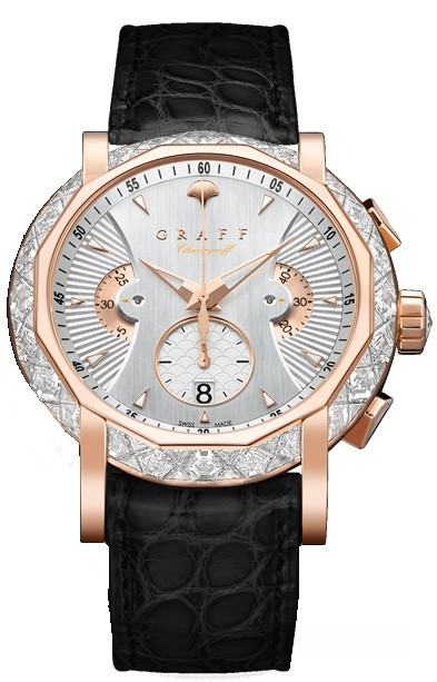 Часы Graff Chronograff 45 mm представлены в корпусе из розового золота 18к размером 45 мм и водонепроницаемостью 30 м. Внутри корпуса установлен автоматический механизм, обладающий запасом хода 42 часа. На серебристом циферблате отображаются часы, минуты, секунды, дта, накопители хронографа. Часы комплеткуются ремешком из кожи аллигатора с вставкой из розового золота 18к. Безель из белых бриллиантов.
