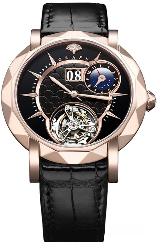 Мужские наручные часы MasterGraff Dual Time Tourbillon RG Black Dial выпущены в корпусе из розовго золота 18к размером 43 мм и водонепроницаемостью до 30 метров. Часы содержат в себе три уникальных усложнения: парящий турбийон, увеличенная дата, двойное время. Калибр 5 с ручным заводом обладает запасом хода 60 часов. На его разработку и выпуск специаисты потратили более 2000 часов. Корпус часов с обеих сторон покрыт сапфировым стеклом. На черном гильошированном циферблате отображаются часы и минуты, по центру, увеличенная апертура даты н а 12-ти часах, а индиктаор второго часового пояса находится на отметке 2-х часов. Модель комплектуется черным ремешком из кожи аллигатора с застежкой из розового золота 18к.