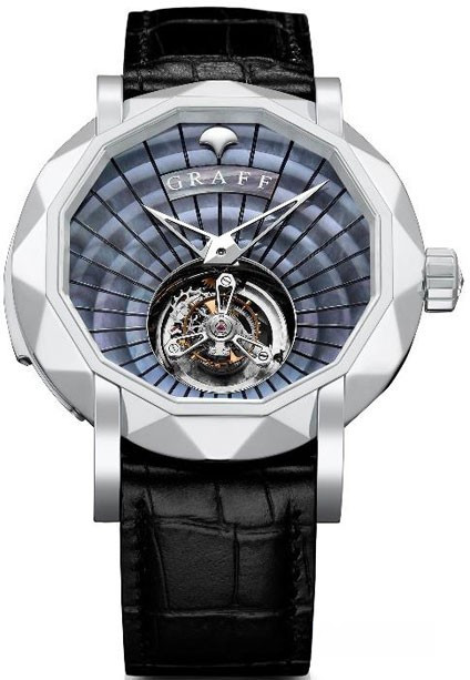 Часы MasterGraff Tourbillon Minute Repeater представлены в корпусе из белого золота 18к диаметром 47мм и водонепроницаемостью 30 метров. На синем жемчужном циферблате отображаются часы, минуты, секунды. Внутри корпуса установлен механизм с ручным заводом, обладающий запасом хода 65 часов. Часы комплектуются ремешком из кожи аллигатора с вставкой из белого золота 18к.